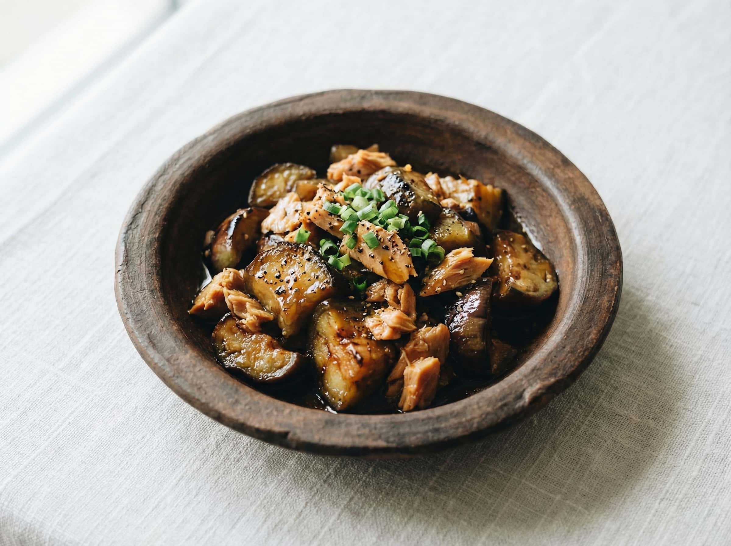 - 鶏ガラの深い旨みがツナとなすに絡み、丼でもおかずでも映える濃厚な一皿に。